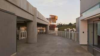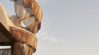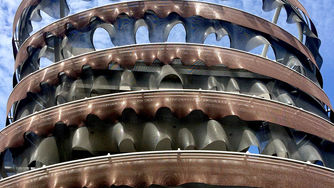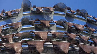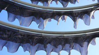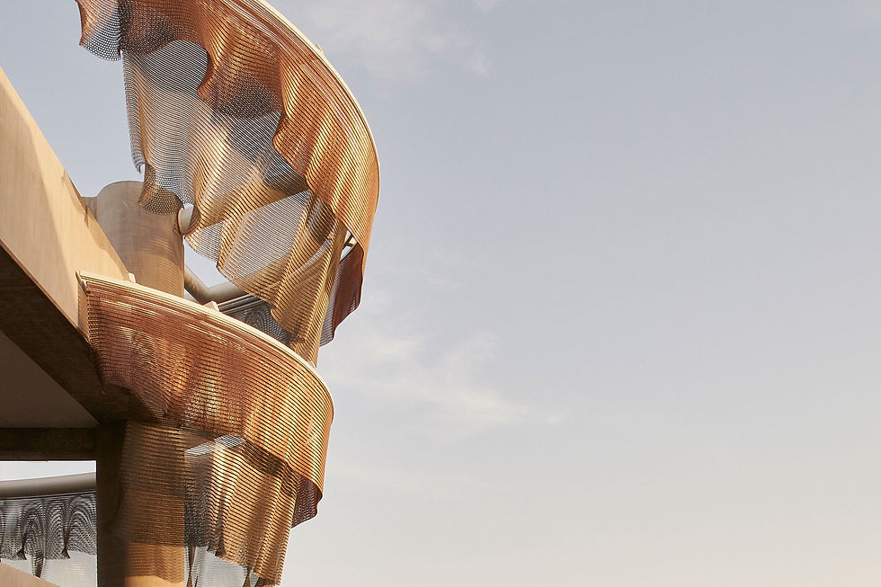 Intended to suggest a garment, the artwork consists of a 100-foot tall oval-shaped tower that is wrapped in multiple layers of a plastic chainmail fabric that ripples in the wind like water. Enagua is the Spanish word for a garment traditionally worn under a dress to give it extra body. The title is also a play on the words En Agua, (in water), referring the liquid motion of the chainmail in the wind and the fact that the entire site lies just a few feet above current sea level. The tower was realized in collaboration with Johnson/Fain Architects and was completed in 2015. - Ned Kahn