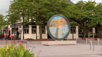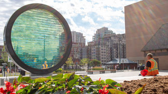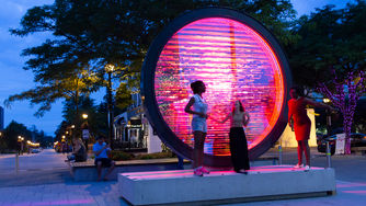 Portal uses colour, light, and optical effects to act as both a mirror reflecting the past and a window to the future. During the day sunlight bounces off the glass, casting a multicolored reflection on the plaza. In the evening the sculpture lights up internally, changes colour, and alternates between reflection and transparency. Paint etched onto the surface of the glass seems to stretch far beyond the threshold of the portal. Portal extends the idea of connection and allows viewers to look back on the path that they have travelled and ahead to where they are going. - Studio F Minus