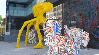 Called STARGATE, the playful installation is the brainchild of Anna Passakas and Radoslaw Kudlinski of Blue Republic. Fronted by 12-ft and 15-ft tall sculptures on either side of Redpath Avenue, the two figures emerge from the chaotically energized glass murals behind them, standing guard—or facing off—to create a 'gate' just south of Roehampton. Flanked by an inter-dimensional cast of supporting characters, the central figures are surrounded by beings emerging from the portals, frozen in the act of becoming. - Urban Toronto
